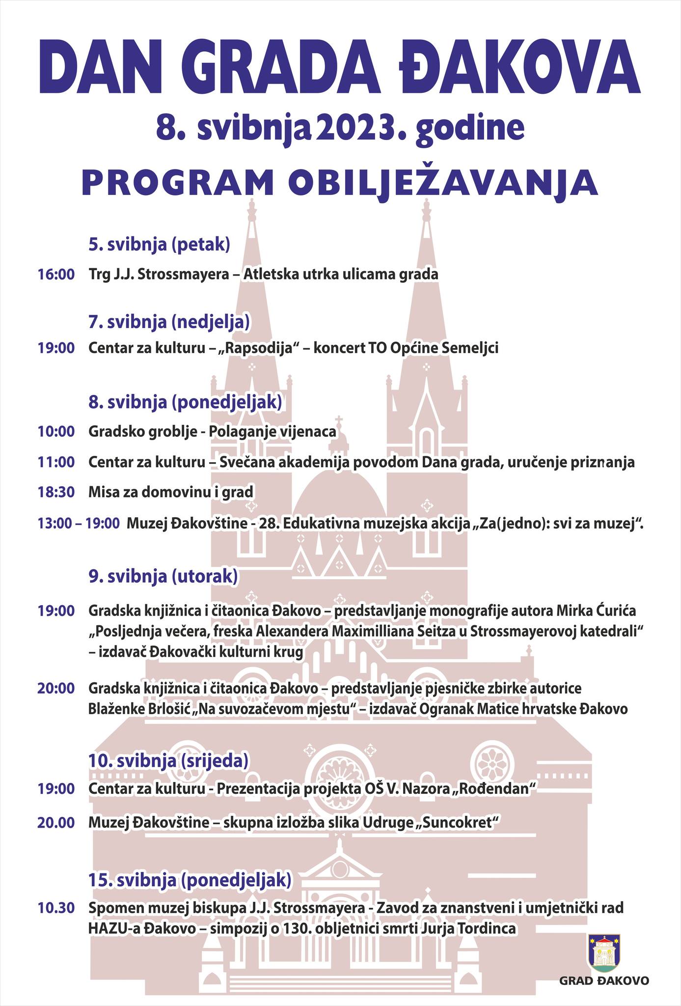 U ponedjeljak, 8 svibnja, Dan je grada Đakova čime se Đakovčani vraćaju u davnu 1239. godinu kada se ime Đakovo po prvi puta spominje u ispravi hrvatsko - ugarskog kralja Bele IV., kojom biskup Ponsa dobiva na dar posjede Đakovo i Breznu. No istraživanja pokazuju i naseljenost u mlađem kamenom dobu gdje Rimljani grade svoje naselje Certissiju.
