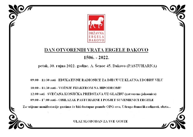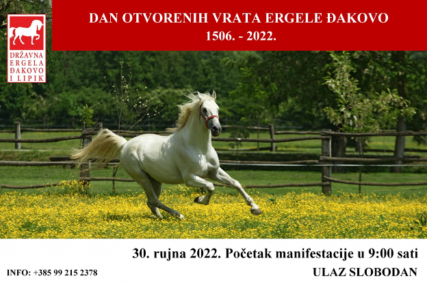 U Državnoj ergeli Đakovo u petak, 30. rujna 2022. godine održat će se manifestacija „DAN OTVORENIH VRATA ERGELE ĐAKOVO“.