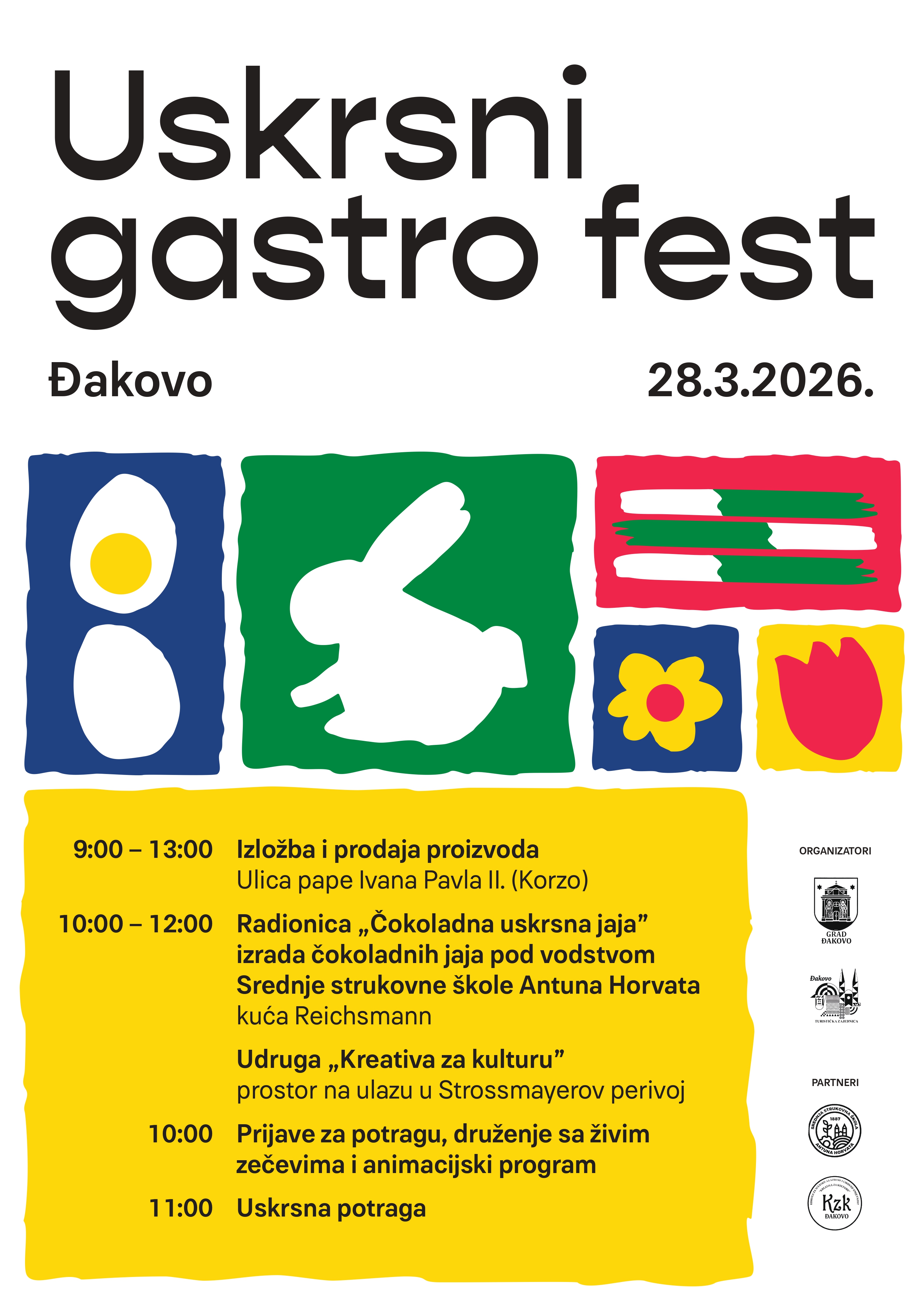 Grad Đakovo i Turistička zajednica Grada Đakova, u suradnji sa Srednjom strukovnom školom Antuna Horvata i Udrugom Kreativa za kulturu, organiziraju Uskrsni gastro fest u subotu, 28. ožujka, na gradskom korzu.
