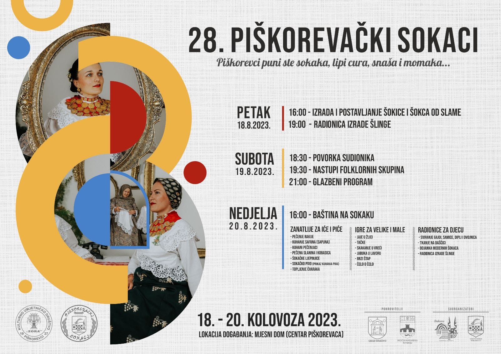 Tradicionalna manifestacija Piškorevački sokaci održat će se po 28. puta od 18. do 20. kolovoza 2023. godine u Mjesnom domu i centru Piškorevaca, a u nastavku donosimo program:
