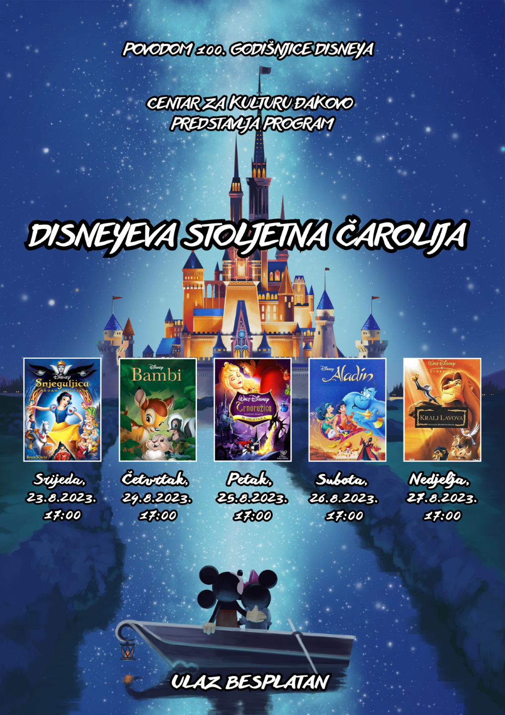 Pripremite se za nezaboravno putovanje kroz čarobni svijet Disneyevih klasika jer bliži se program koji ne smijete propustiti! Centar za kulturu Đakovo poziva vas da od srijede, 23. kolovoza do nedjelje, 27. kolovoza uživate u posebnom filmskom programu „Disneyeva stoljetna čarolija“ kojim će se obilježiti 100. godišnjica Disneyevog djelovanja. Ova nevjerojatna retrospektiva pružit će vam priliku da ponovno doživite najdraže trenutke iz djetinjstva i stvorite nove uspomene sa svojim najmilijima.