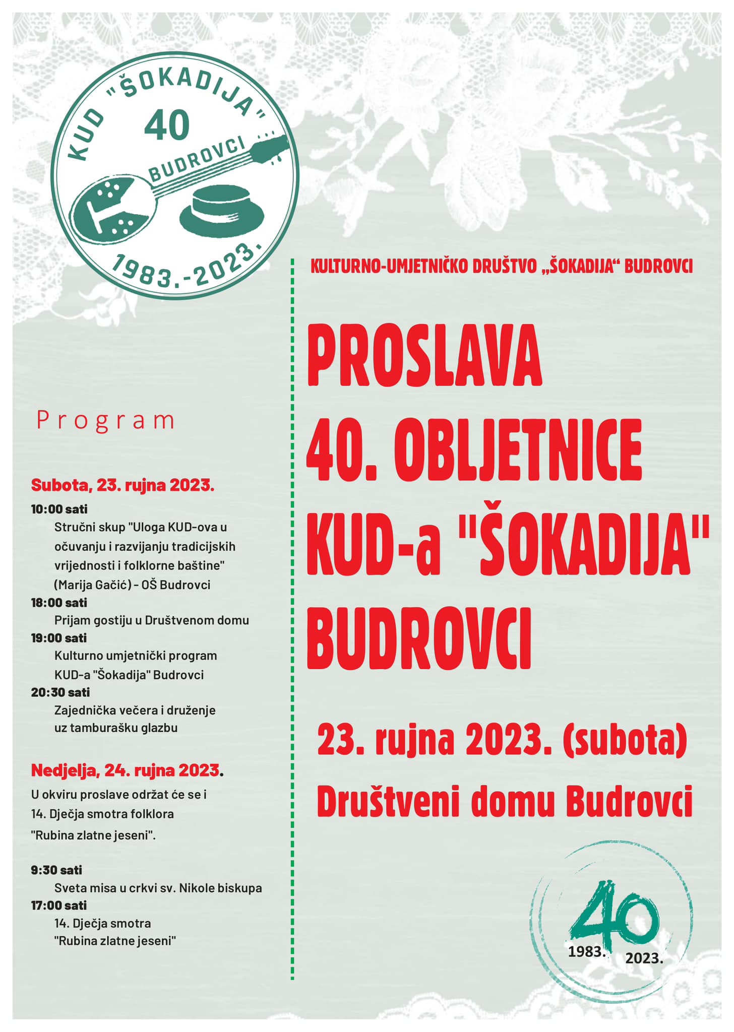 U subotu i nedjelju 23. i 24. rujna 2023. godine KUD „Šokadija“ prigodnim će programom proslaviti 40 godina postojanja: