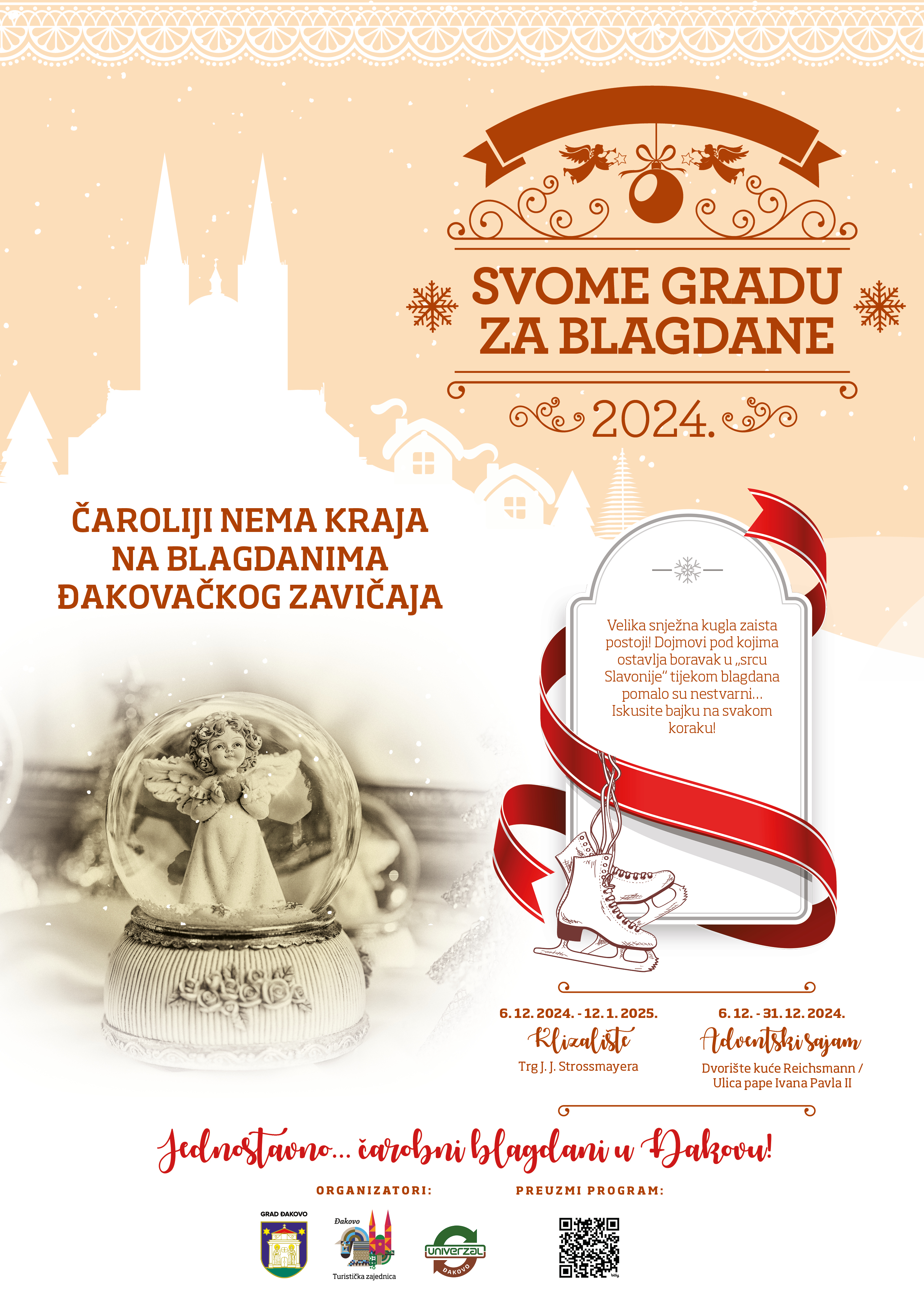 Da velika snježna kugla zaista postoji dokaz su čarobni blagdani u Đakovu kada se ulice grada odijevaju u tisuće blistavih lampica kojima odjekuju zvuci praporaca s lipicanske kočije i blistaju osmjesi s ozarenih lica. Dojmovi pod kojima ostavlja boravak u „srcu Slavonije“ tijekom blagdana pomalo su nestvarni. Samo u Đakovu iskusite bajku na svakom koraku!