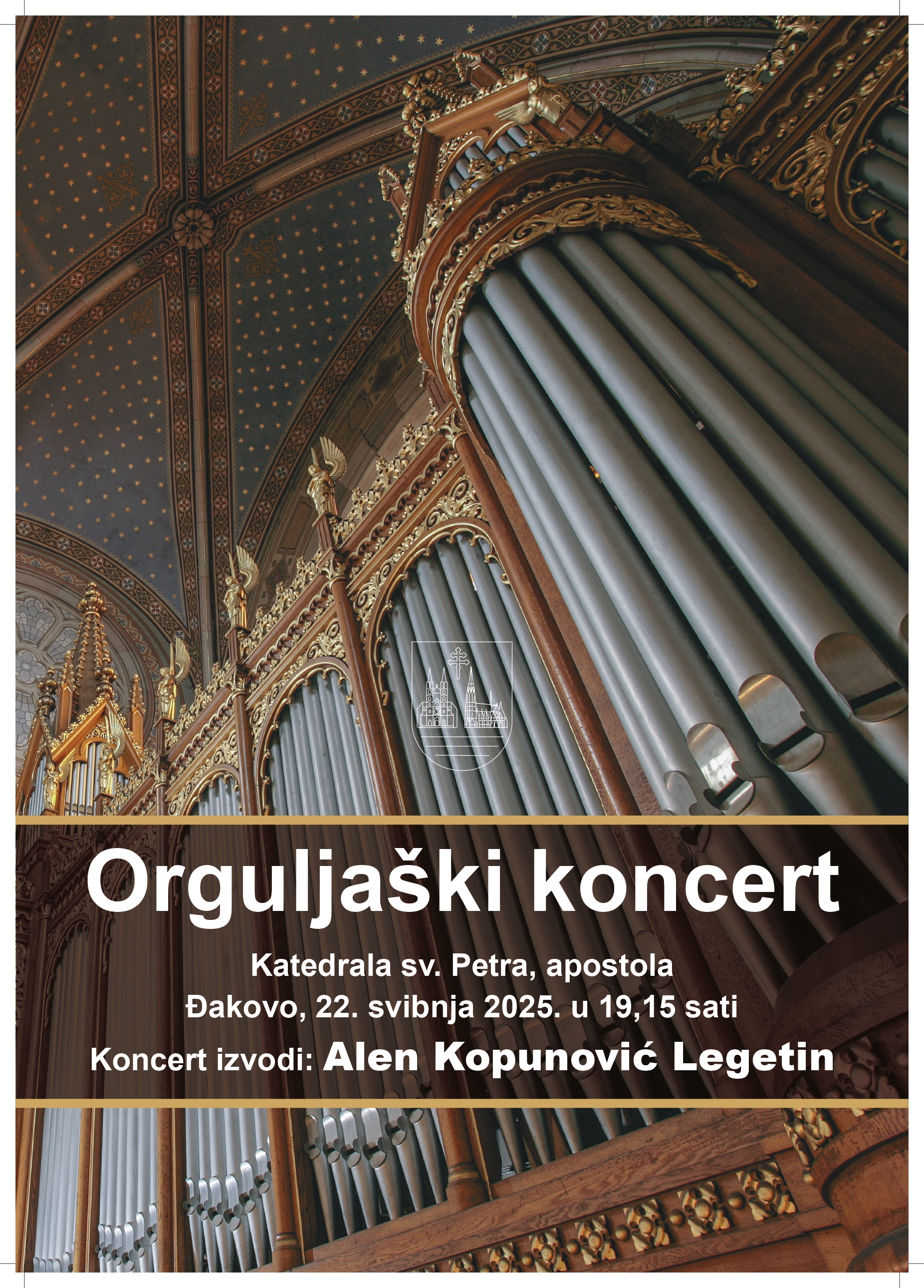 U četvrtak, 22. svibnja 2025. u 19,15 sati u katedrali sv. Petra u Đakovu orguljaš Alen Kopunović Legetin održat će koncert. Na programu koncerta su djela A. Vidakovića, T. Duboisa, G. A. Sorgea, M. T. von Paradies, H. Muleta, J. S. Bacha, J. Reubkea. Koncert organizira Ured za crkvenu glazbu Đakovačko osječke nadbiskupije.