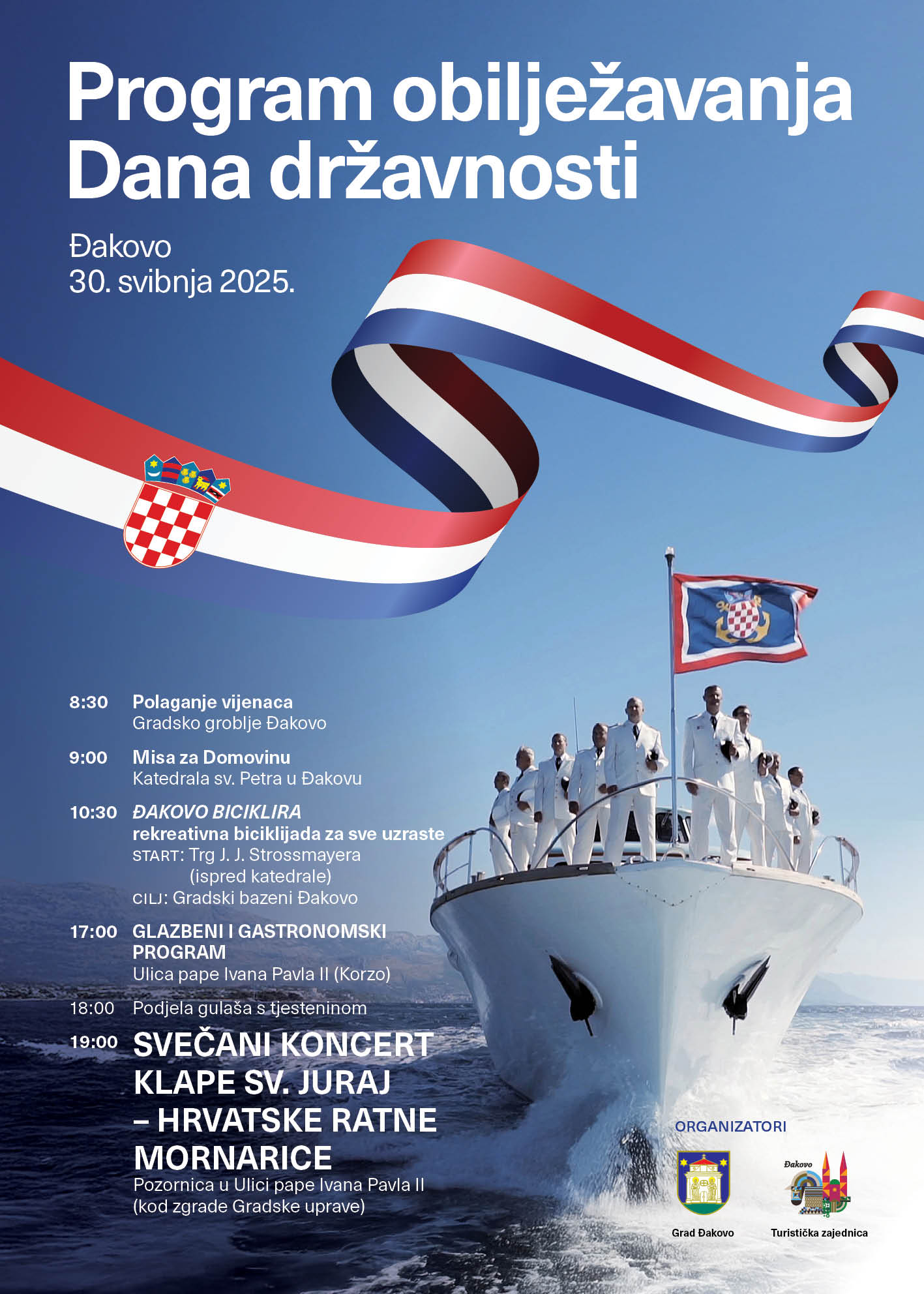 Povodom Dana državnosti Republike Hrvatske, Grad Đakovo i Turistička zajednica grada Đakova organiziraju obilježavanje u petak, 30. svibnja 2025. godine, uz prigodan program za sve građane i posjetitelje.