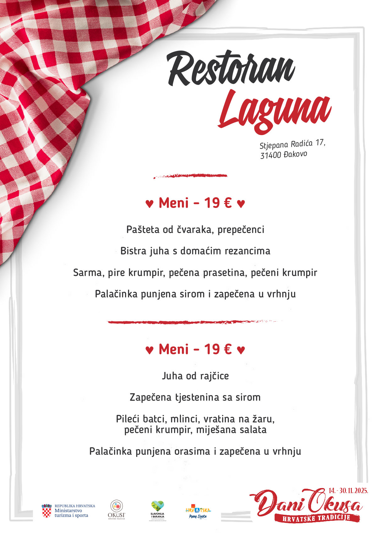 U razdoblju od 14. do 30. studenoga 2025., Đakovo postaje dio nacionalne manifestacije 6. Dani okusa hrvatske tradicije! Tri dobro poznata restorana te vinoteka i kušaonica uključit će se u kreiranje posebnih, tradicionalnih menija po promotivnim cijenama i tako postati dio šire priče s ciljem razvoja novih turističkih proizvoda i obogaćivanja turističke ponude. Prepustite se vrhunskim okusima, sjajnoj atmosferi i bogatoj ponudi srca Slavonije te istražite restorane s oznakom standarda Okusi tradicije Slavonije i Baranje.