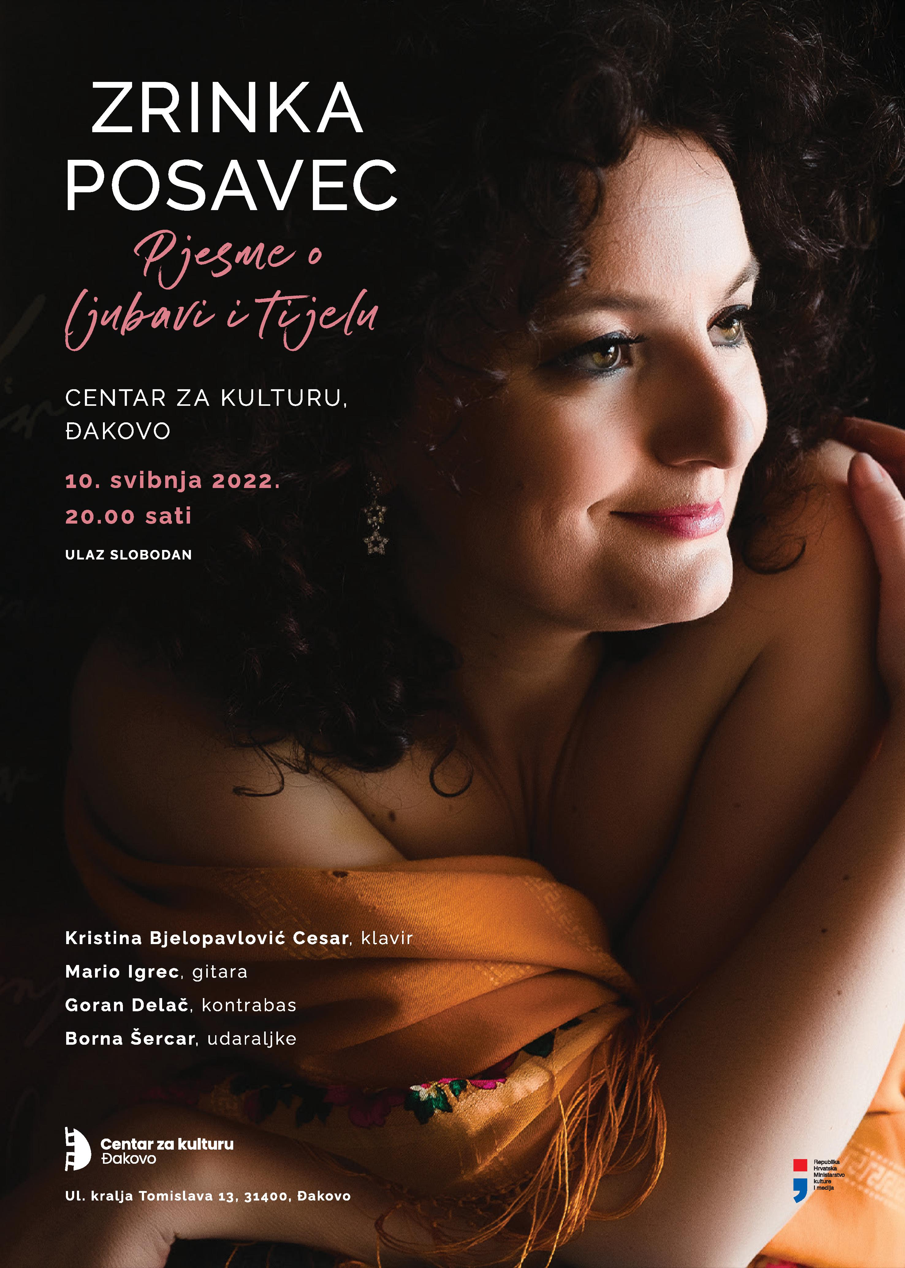 Glazbenica Zrinka Posavec održat će 10. svibnja 2022. u Centru za kulturu u Đakovu koncert pod nazivom „Pjesme o ljubavi i tijelu“ što je naziv i njezinog najnovijeg, trećeg po redu albuma objavljenog u jesen 2021. u izdanju Croatie Recordsa. Uz Zrinku Posavec na koncertu će nastupiti glazbenici: Kristina Bjelopavlović Cesar - klavir, Mario Igrec – gitara, Goran Delač – kontrabas i Borna Šercar – udaraljke.